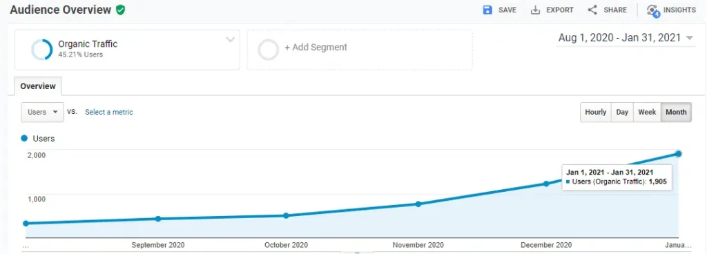 Within weeks, the website showed remarkable improvements, with organic traffic growing from 329 visitors in August 2020 to 1,900 visitors by January 2021—an increase of over 100% in just four months.